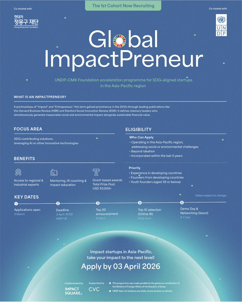 CMK NEWS 재단의 주요 이슈를 한눈에! 현대차 정몽구 재단·UNDP 아시아태평양 임팩트 기업가 육성 프로그램 출범 현대차 정몽구 재단·UNDP 아시아태평양 임팩트 기업가 육성 프로그램 출범 현대차 정몽구 재단·UNDP 아시아태평양 임팩트 기업가 육성 프로그램 출범 현대차 정몽구 재단과 유엔개발계획(UNDP) 서울정책센터가 공동 주최하고, 임팩트스퀘어가 주관하는 ‘글로벌 임팩트프러너(Global Impact Preneur)’가 아시아태평양 임팩트 스타트업 선발 및 육성에 나선다. 본 프로그램은 […]
